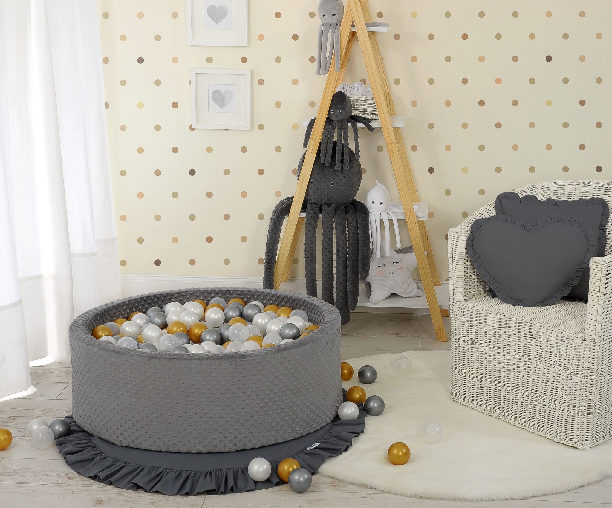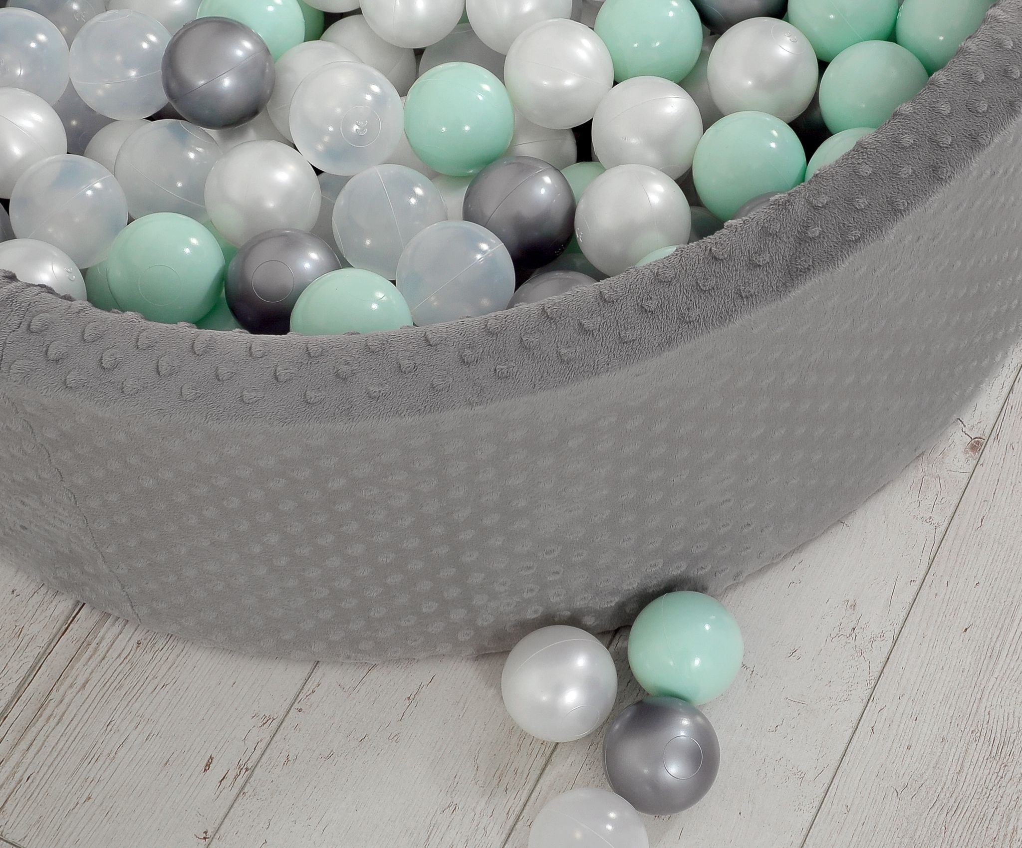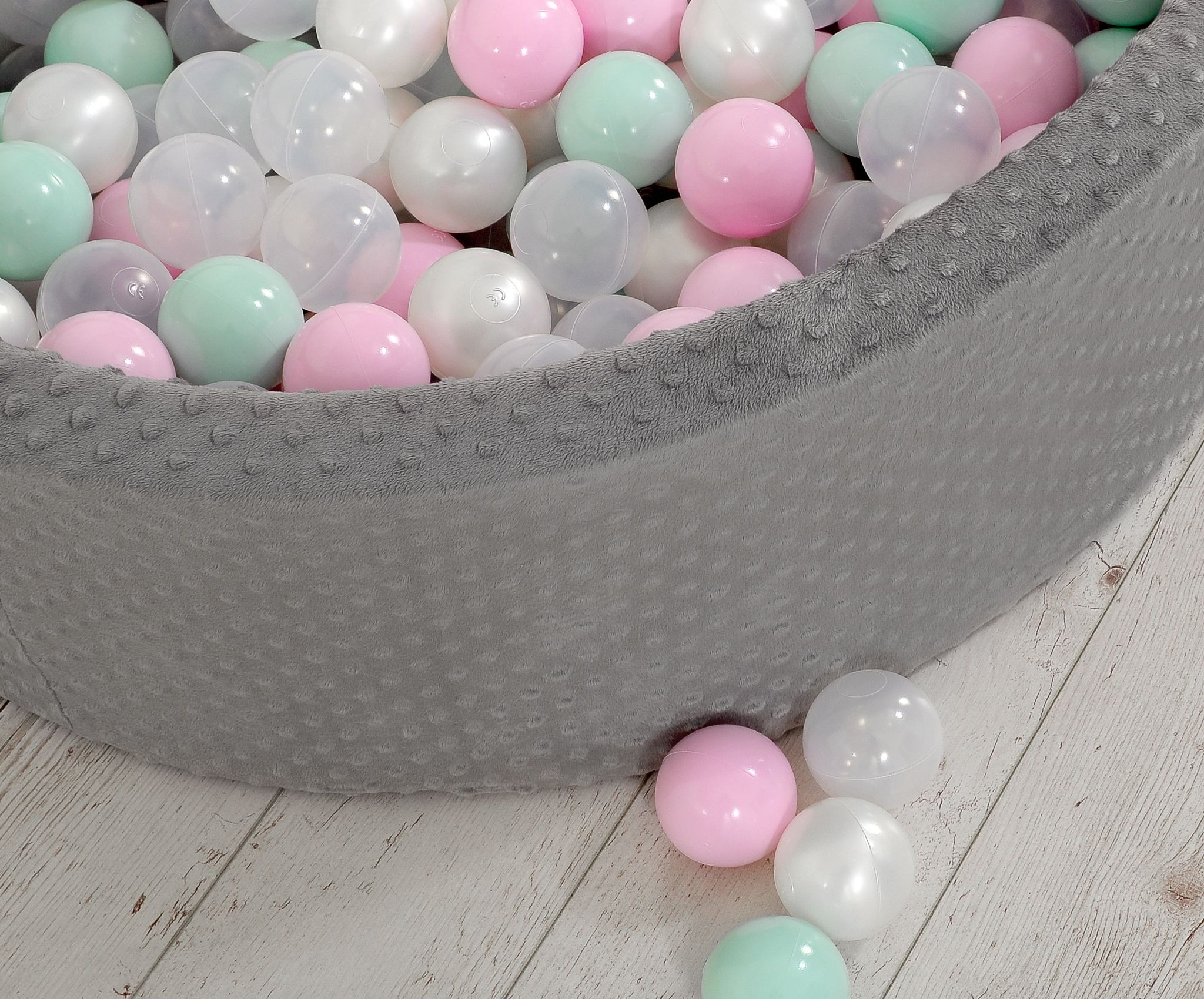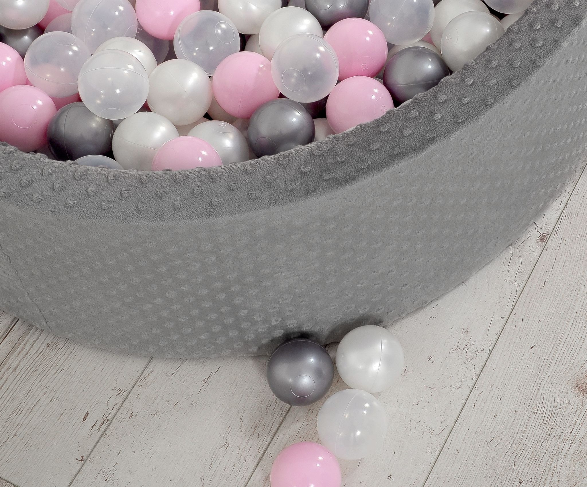 De ronde ballenbak is gemaakt van zacht schuim, waardoor je kindje comfortabel en veilig kan spelen. De stevige schuimwanden bieden ondersteuning tijdens het spelen en zorgen voor extra bescherming. De afneembare hoes is voorzien van een handige rits en gemaakt van zacht minky fleece, wat zorgt voor een heerlijk zachte aanraking.