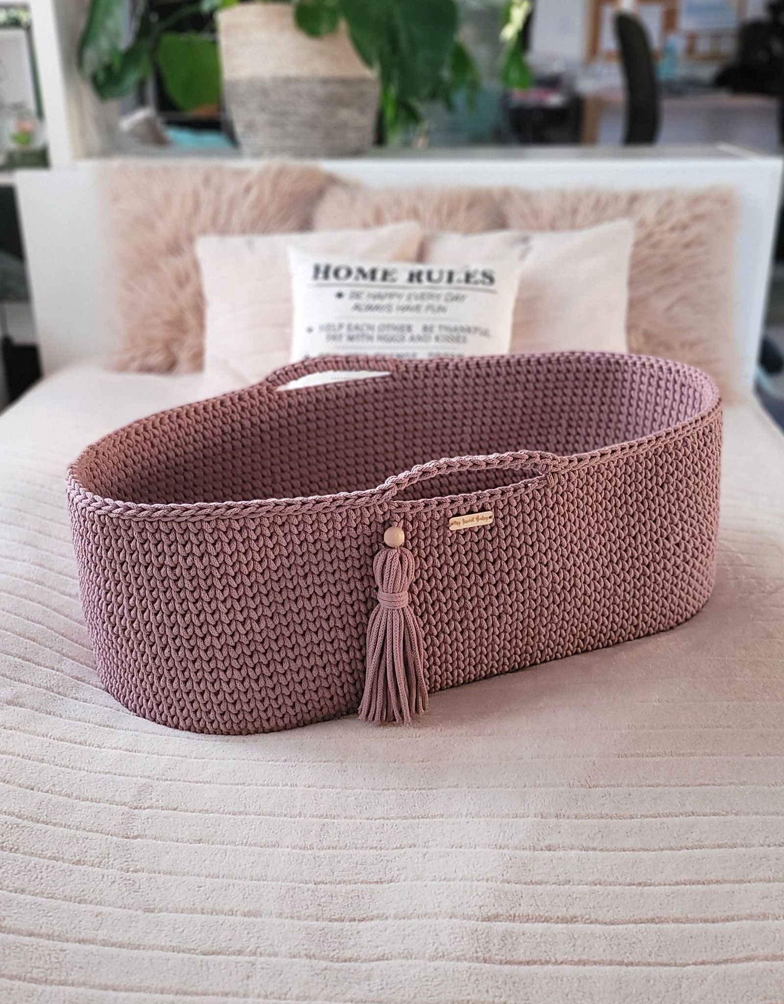 Deze gehaakte wieg is het perfecte bedje voor jouw kleintje. Hij is gehaakt van 100% katoen en heeft stevige zijkanten. De bodem van de gehaakte mozesmand is gemaakt van massief multiplex van 6 mm dik. De mand kan worden gebruikt voor baby’s tot ongeveer 5 à 6 maanden (afhankelijk van het kind) en een gewicht van maximaal 8 kg. Aan het handvat hangt een handgemaakte kwast in de kleur van het mandje, met een houten kraal.