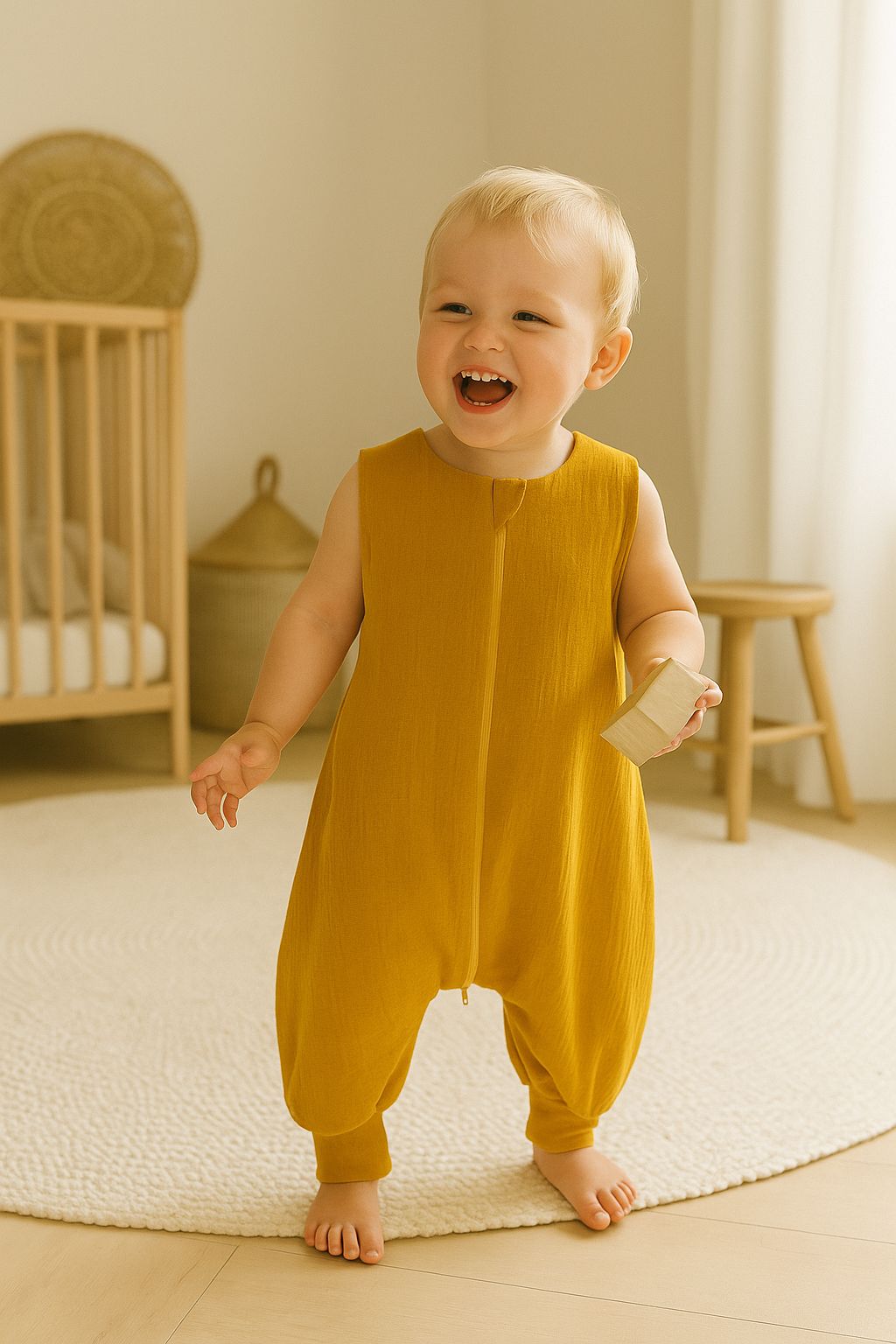 De lichte mousseline babyslaapzak is gemaakt van duurzaam, 100% gecertificeerd katoenen kreukmousseline. Mousseline is zacht en aangenaam om aan te raken, en irriteert de tere babyhuid niet. Tegelijkertijd is het materiaal uiterst praktisch in gebruik.